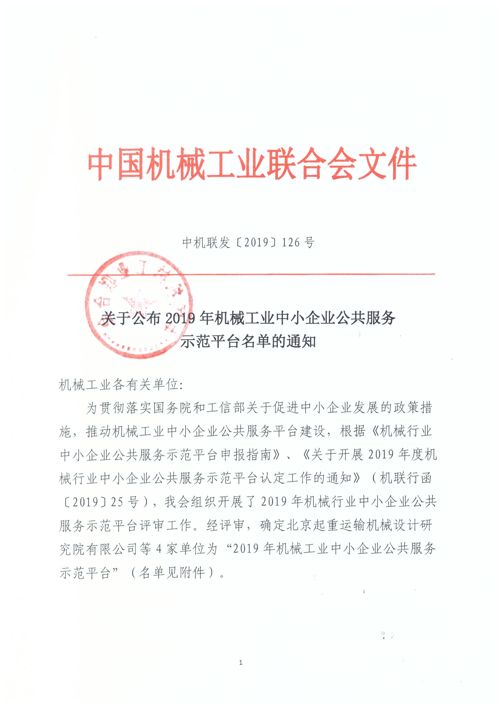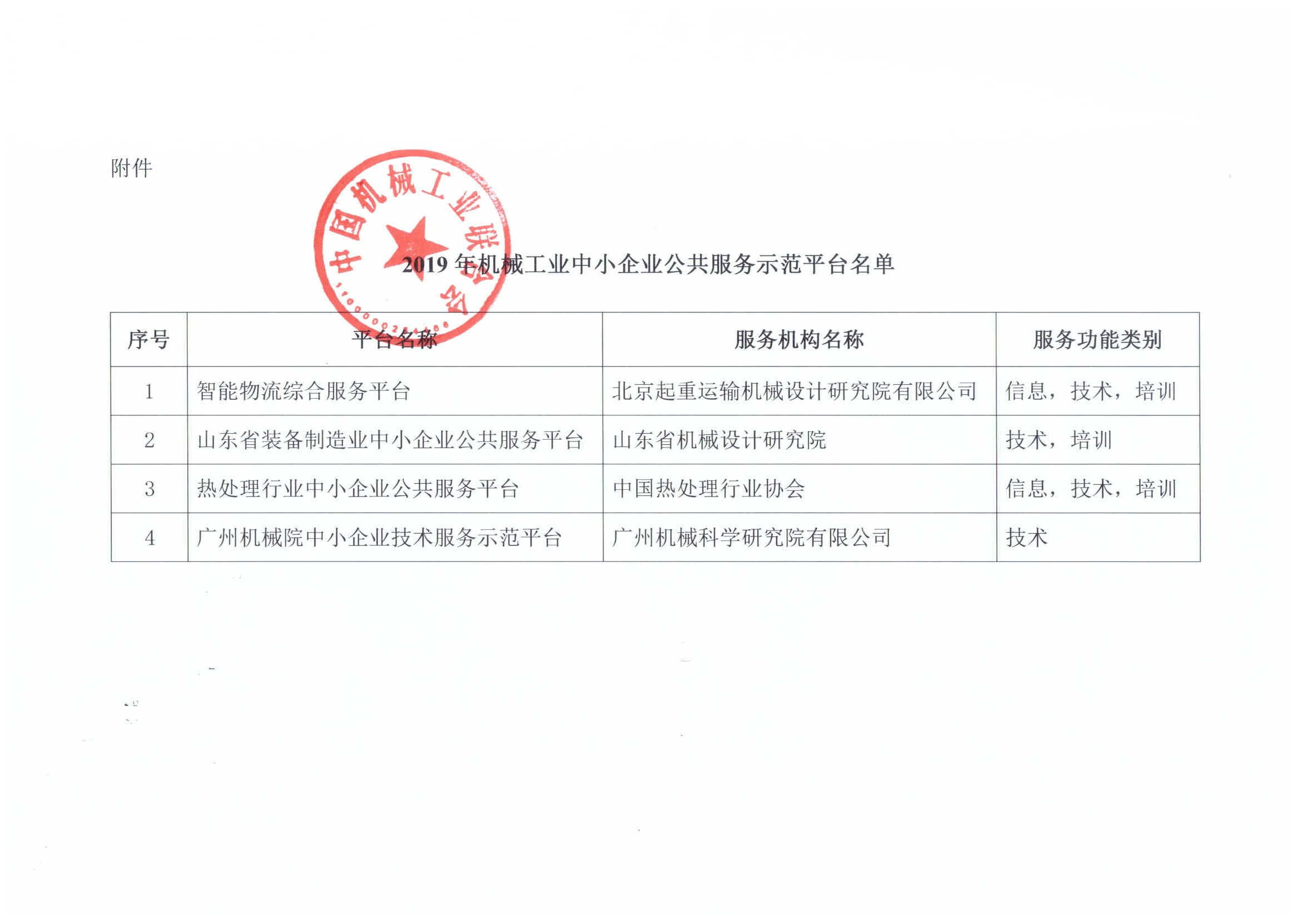 2019年7月10日,经中国机械工业联合会评审,北起院荣获“机械行业中小企业公共服务示范平台”(省部级平台,以下简称“示范平台”)称号,被授予面向机械行业提供信息服务、技术服务、培训服务三项功能。